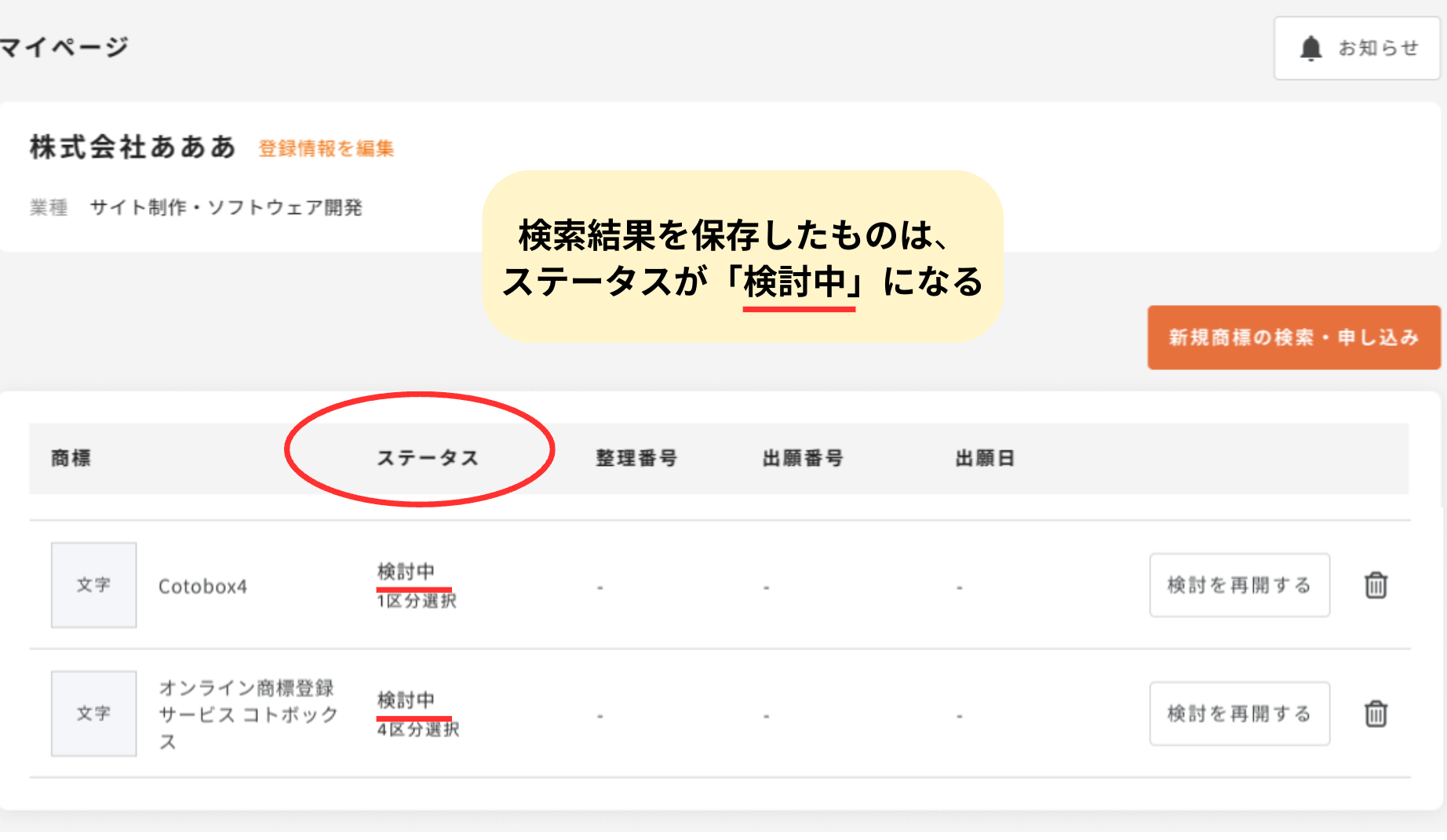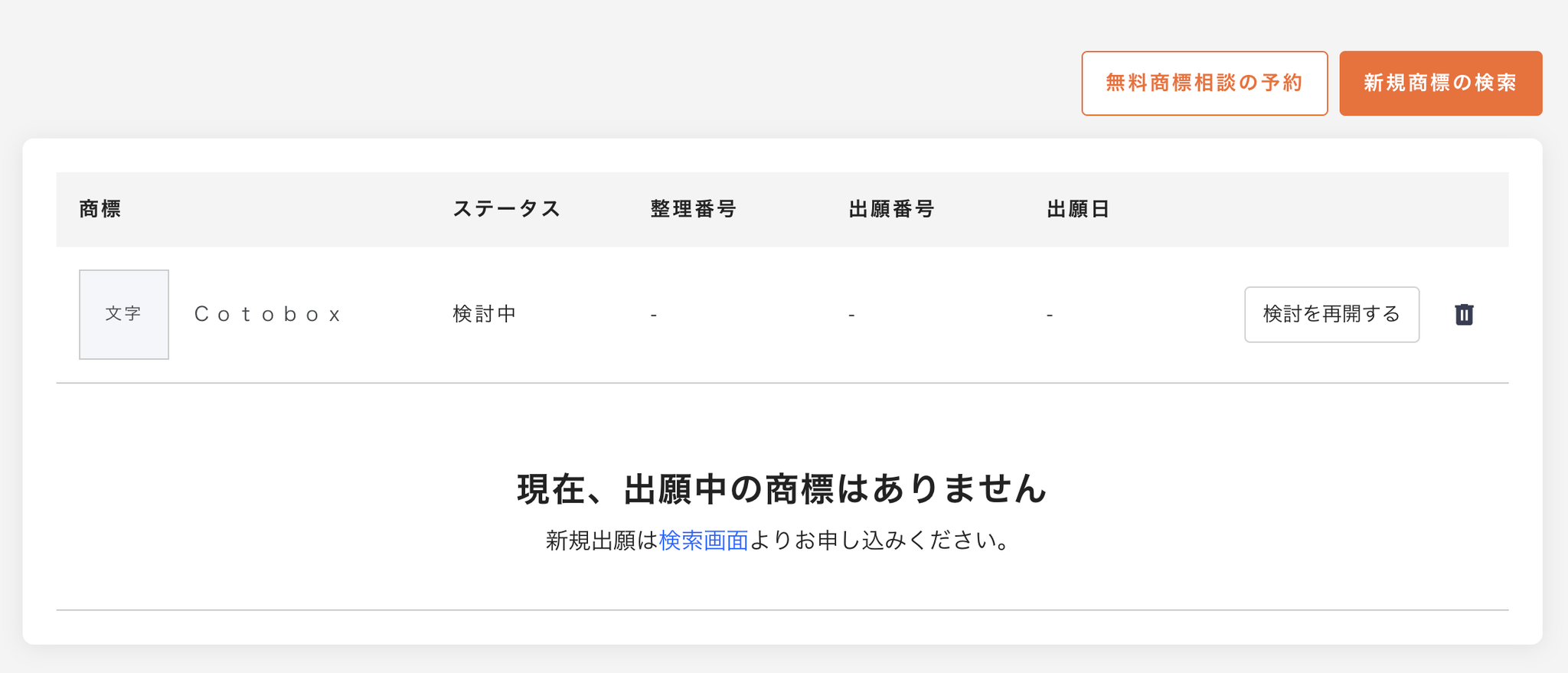 - 保存した商標情報はステータス「検討中」で表示されます。