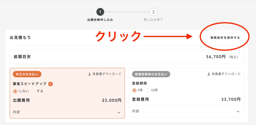 - 検索結果が表示されたら、「見積書・内容確認に進む」をクリックしてお進みいただき、お見積り項目の右側にございます「検討条件の保存」ボタンで入力項目を保存することができます。(商標と選択した区分が保存されます)