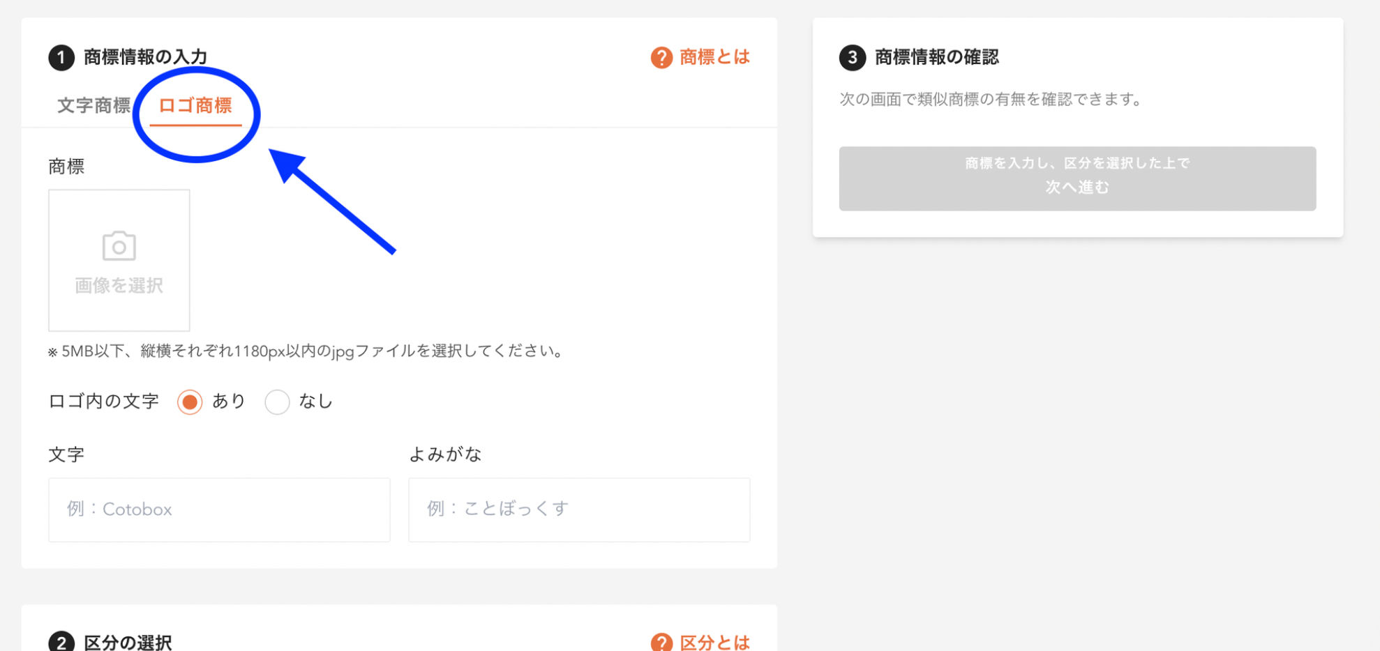 - ①商標情報の入力 でタブを「ロゴ商標」に切り替え、JPEG画像をアップロードしてください。