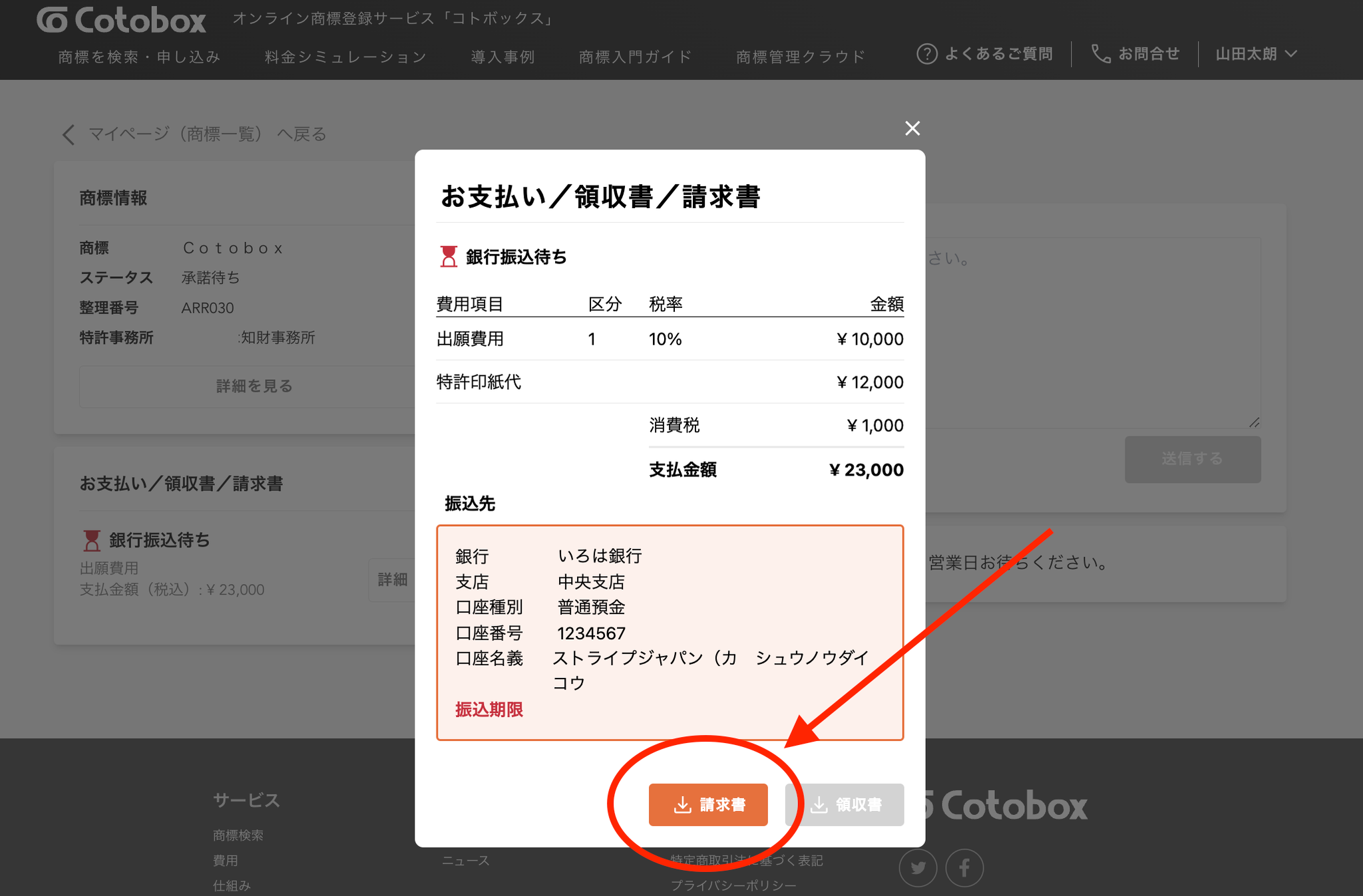 決済画面にて「銀行振込」ボタンをご選択いただきますと、メールで請求書が届きます。メールにて通知される専用口座へのお振り込みによりお申し込みも完了し、Cotobox提携弁理士が内容確認を始めます。